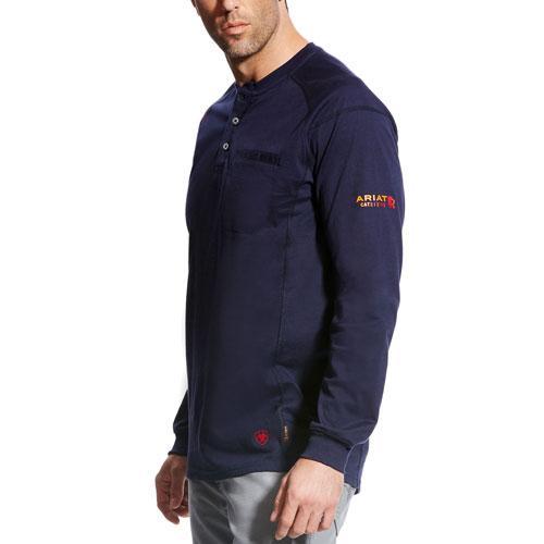 Get all day lightweight comfort in this FR shirt from Ariat! This flame resistant henley features Greater Arm Mobility technology that allows excellent range of motion by extending the inseams of the garment to the cuffs and shirt tail do not shift while you're working. This piece of FR clothing is finished with a chest pocket with Velcro closure to secure your belongings