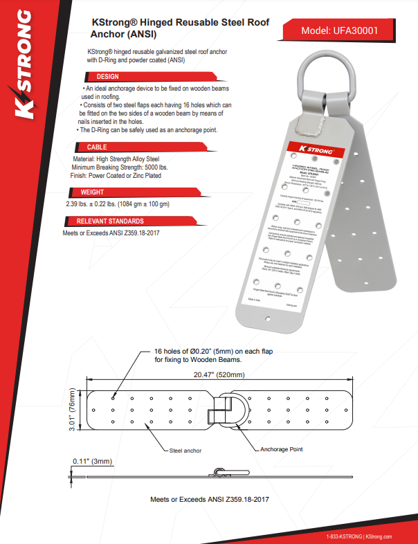 KStrong® hinged reusable galvanized steel roof anchor with D-Ring and powder coated (ANSI)