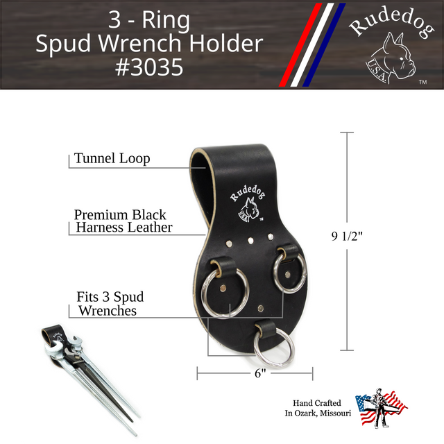 Used with all Erection Wrenches. Constructed of heavy 13 - 15 oz Black Harness Leather with a tunnel loop, that can be used with up to a 3" wide belt. The Black Harness Leather, it is more resistant to wear & water and it will take longer for to stretch out. This erection wrench scabbard has 3 rings and is great for holding the standard spuds.